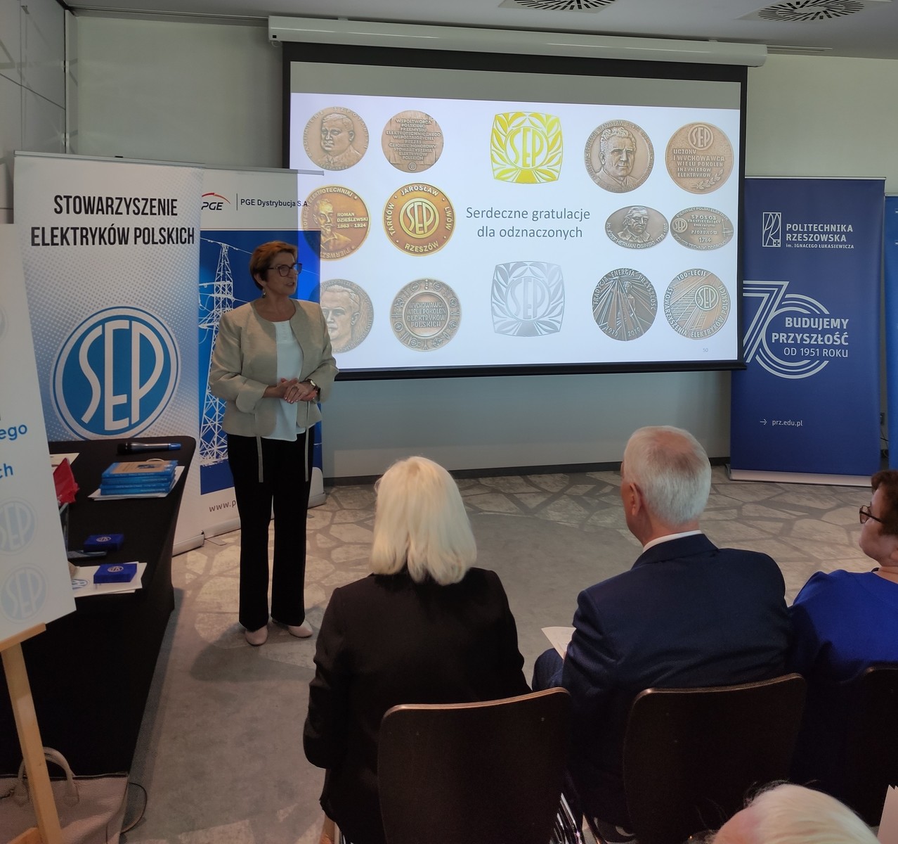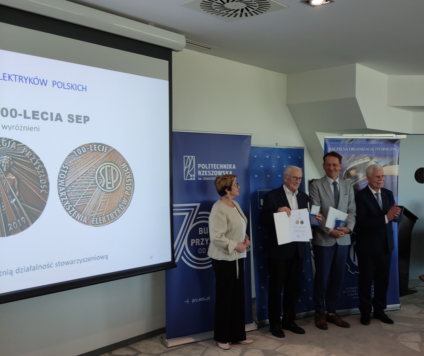 Za aktywną długoletnią działalność stowarzyszeniową, Medalem 100-lecia SEP został uhonorowany JM Rektor Politechniki Rzeszowskiej prof. dr hab. inż. Piotr Koszelnik oraz Dziekan Wydziału Elektrotechniki i Informatyki Kol. Roman Zajdel.